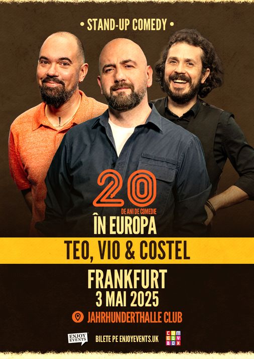 Te așteptăm la Frankfurt, pe data de 3 Mai, la show-ul de stand-up comedy cu Teo, Vio și Costel - 20 DE ANI DE COMEDIE ÎN EUROPA!